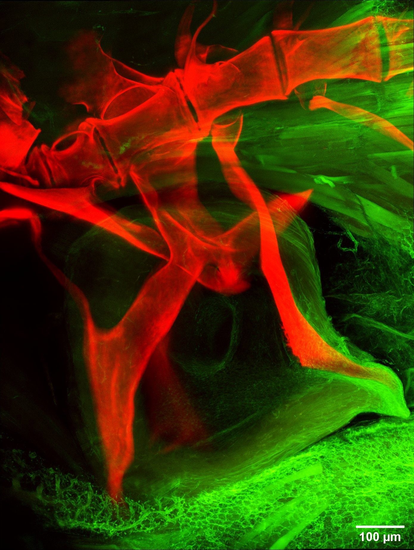 Two-photon image projection of the drumming apparatus of a male Danionella cerebrum. Red bone staining via alizarin red, and green fibre staining via phalloidin-Alexa488. The drumming muscle attaches to the 5th rib and has a hollow cavity that houses the drumming cartilage. The interplay between these component leads to the production of a very loud pulse by compressing the swim bladder.