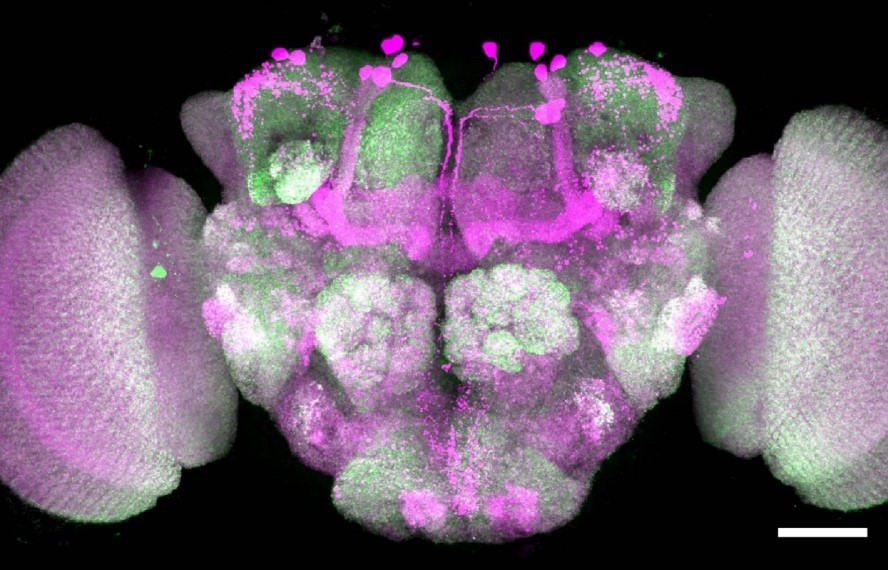 An image of a fruit fly brain. Individual nerve cells are marked through targeted activation (magenta), while neuronal connections are shown in green. © Anatoli Ender