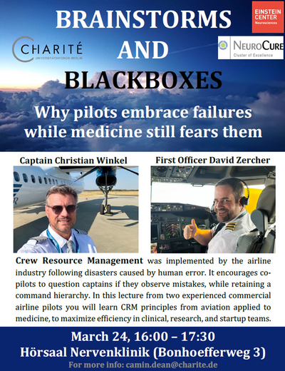 Presented by Captain Christian Winkel and First Officer David Zerchern, in this lecture you'll learn Crew Resource Management (CRM) principles - implemented by the airline industry following disasters caused by human error - to maximize efficiency in clinical, research, and startup teams.