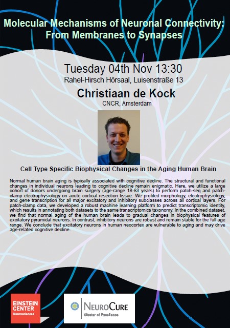 On behalf of Molecular Mechanisms of Neuronal Connectivity: From Membranes to Synapses' Group, Christiaan de Kock from CNCR, Amsterdam will give a talk titled "Cell Type Specific Biophysical Changes in the Aging Human Brain" as part of the ongoing Student/Postdoc-Run Speaker Series (SPRSS).