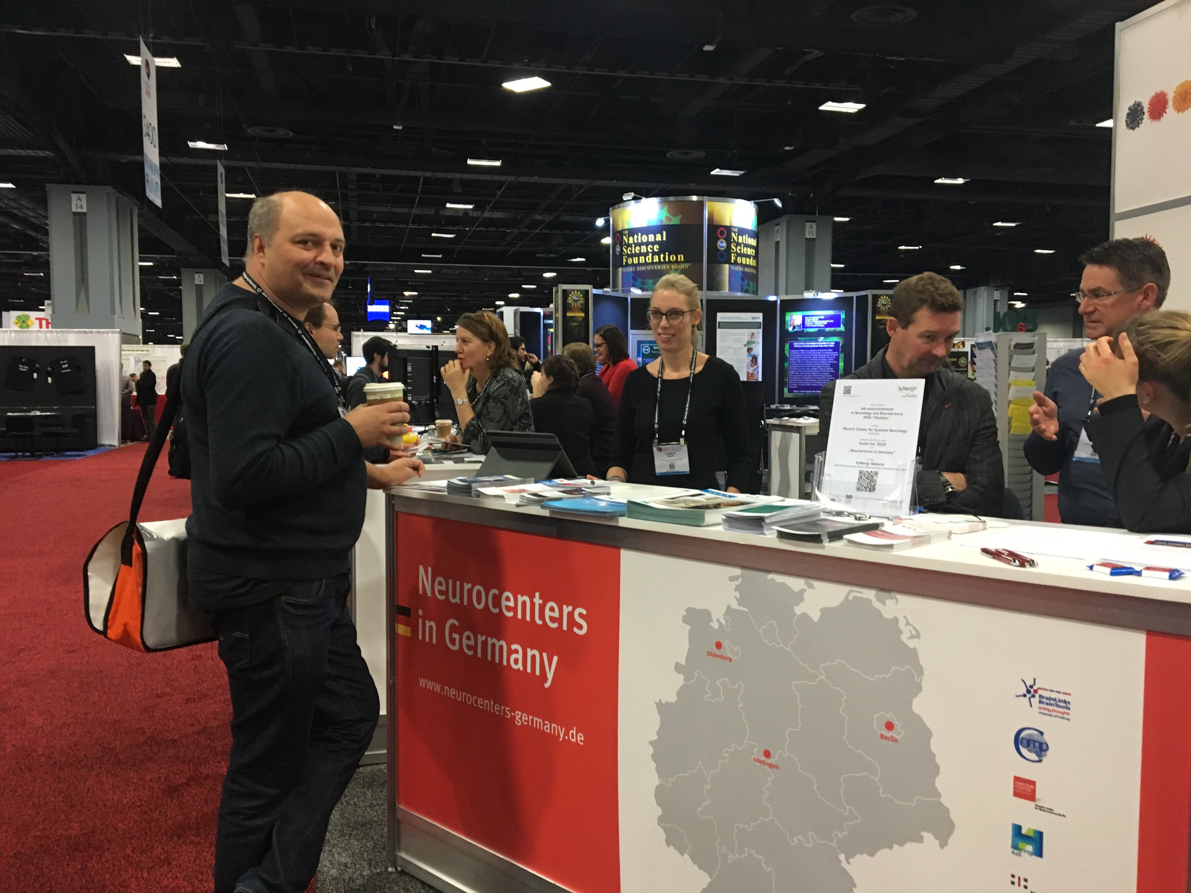 The joint Neuroscience booth was established in 2014 and has proven to be extremely successful for all participants. The booth also has grown steadily over the years: initially existing only as a “German Row” of booths with the Bernstein Center for Computational Neuroscience Berlin and the German Graduate Schools for Neuroscience, the booth was expanded with the participation of the "Research in Germany" initiative and the NeuroClusters. In the last two years, the Einstein Center for Neurosciences Berlin (2016) as well as the Hertie Institute for Clinical Brain Research (HIH) and the Max Planck Society (2017) joined the booth as the newest members of the joint “Neuroscience in Germany” booth.