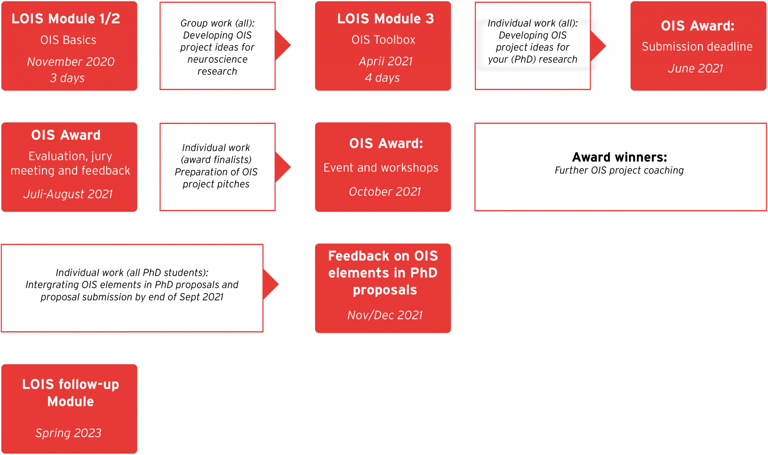 This OIS toolbox module will introduce participating PhD students to a selection of OIS strategies, methods and tools for addressing relevant challenges related to contemporary scientific research in general and PhD activities in particular. Considering the learning outcome from the previous modules, participants will present and discuss their initial OIS project ideas and develop a preliminary OIS toolbox for the field of Neuroscience along the entire process of generating novel scientific research and translating scientific insight into innovation. Furthermore, the module will introduce and guide participating PhD students to reflect upon their ideas for integrating OIS in their own PhD work, and start developing respective OIS project proposals, preparing them to submit their proposals to the OIS Award of the Einstein Center for Neurosciences Berlin.